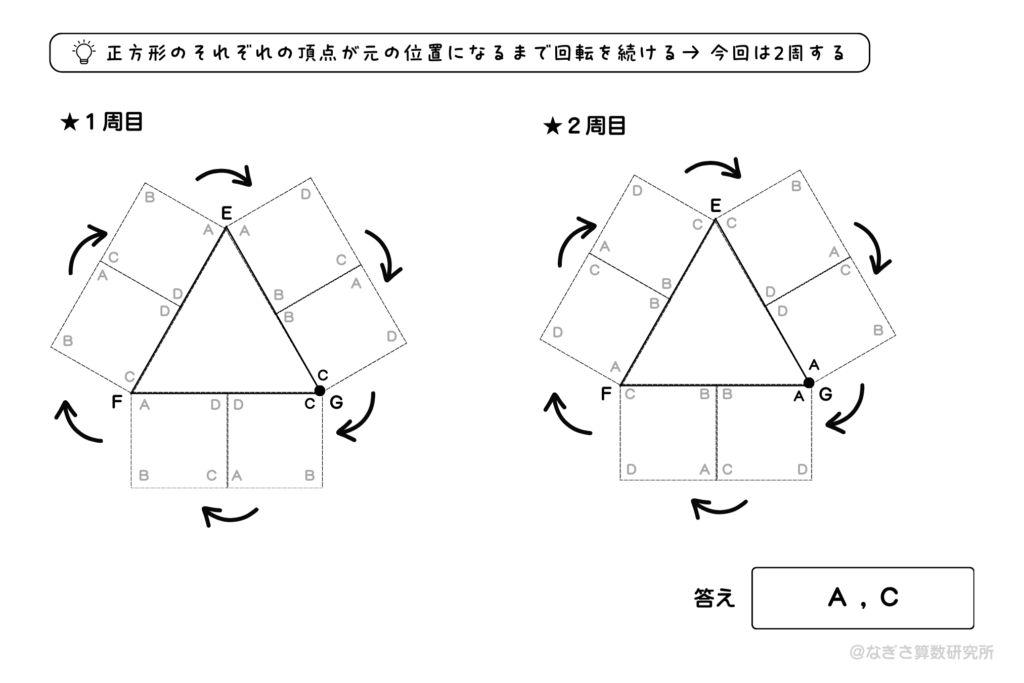 図形の回転の問題。各頂点の移動を正確に捉える必要あり。作業で解くこともできるが、公倍数を利用して解くことも可能。