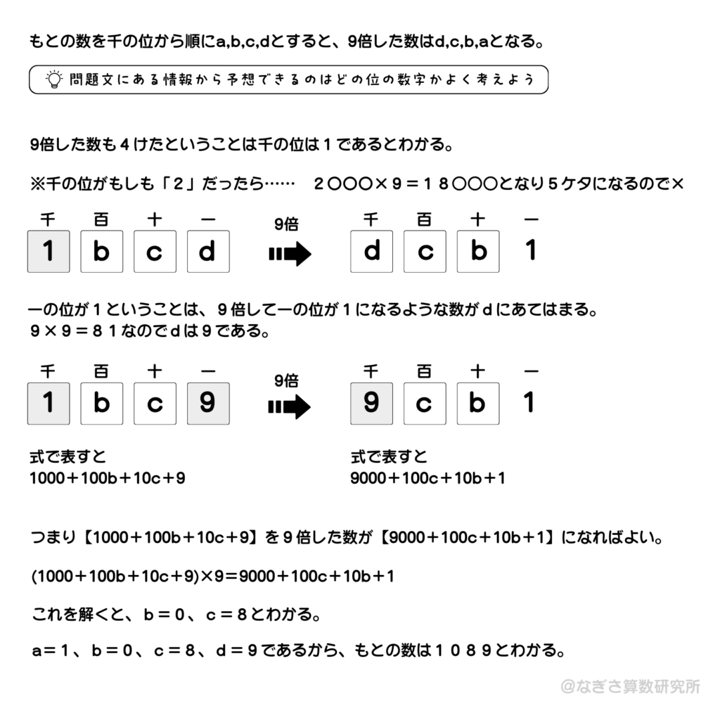 大問2の1問目からやや難問。問題文から与えられた情報をもとに千の位が1であること、一の位が9であることに気づけるかが鍵。残りの十の位と百の位の数字は方程式で求めることができる。