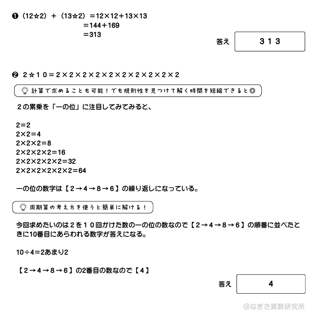 ①〜③の3問構成。①は基本的な約束記号なので確実に得点したいところ。②と③は規則性に注目して周期算の要領で解いていきましょう。